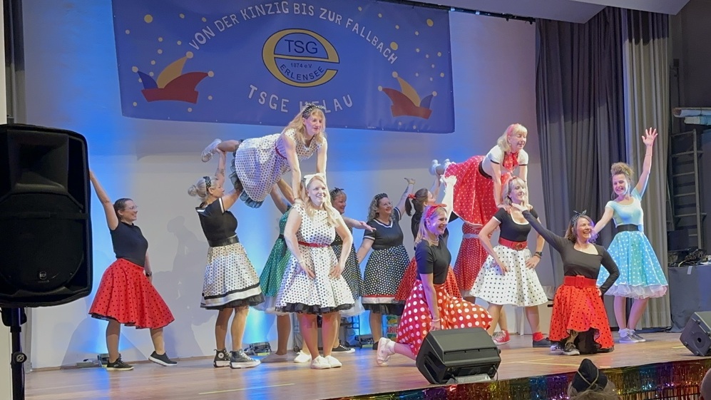 Nach der Pause startete das Programm mit einem echten Knaller. Die neu gegründete Tanzgruppe „Muddivation“ zeigte humorvoll, womit sich die brave Hausfrau der 50er-Jahre beschäftigt, wenn der Mann außer Haus ist. Anschließend berichtete der „Erlenseher“ Torsten Muttke mit Gitarre und Augenzwinkern davon, was in Erlensee angeblich alles fehlt.