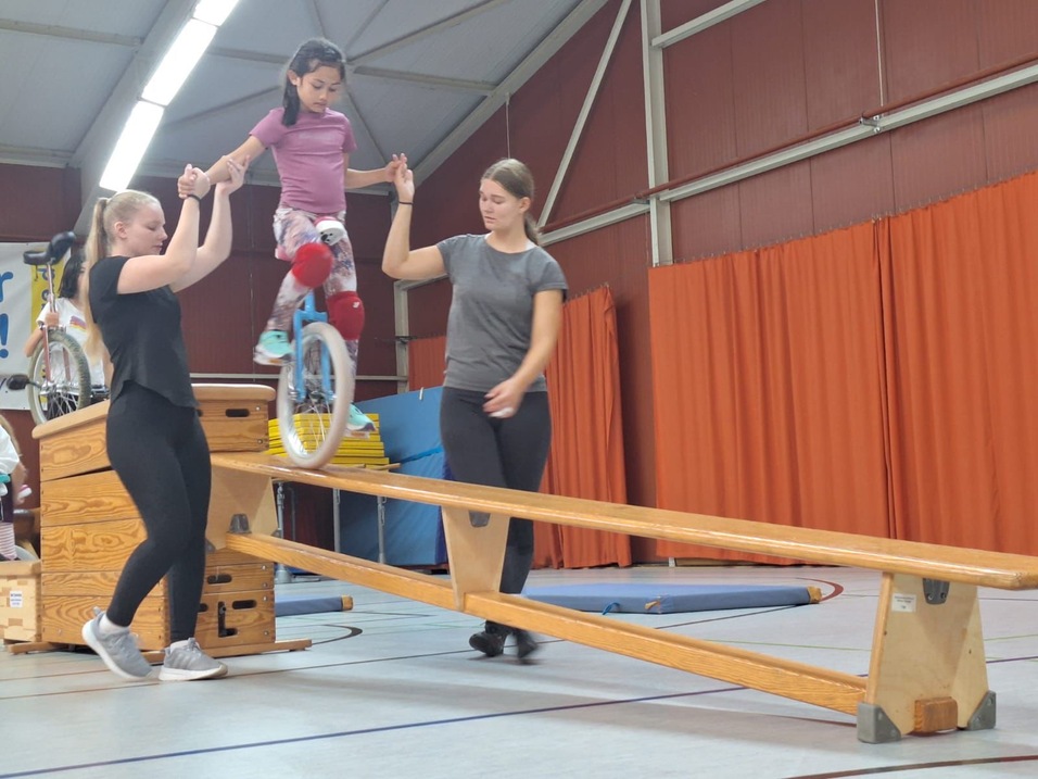 Nun ging es mit dem neuen Sportgerät zu den aufgebauten Hilfs-Mitteln. Nach kurzer Einweisung, wie man aufs Rad kommt, wurden die ersten Meter schon alleine zwischen den Tisch-Hilfen zurückgelegt. Nachdem sich die Kinder etwas ans Einrad gewöhnt hatten, ging es auch schon mal an der Hand durch die Halle.