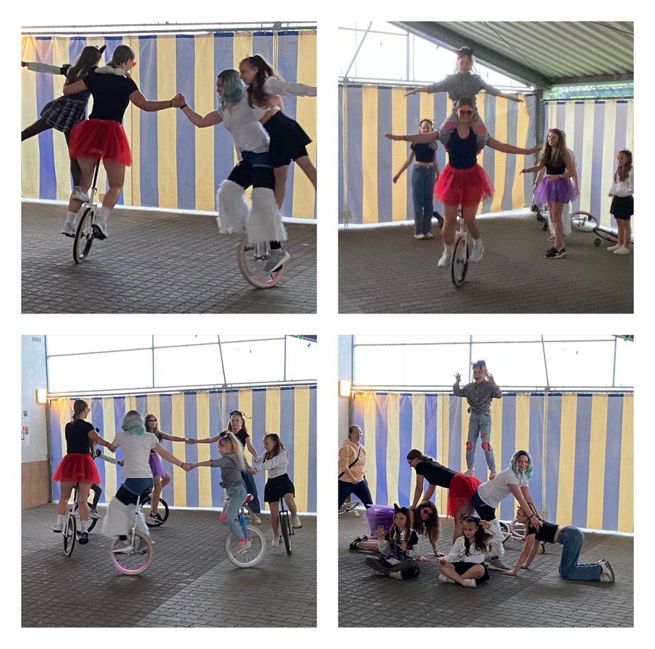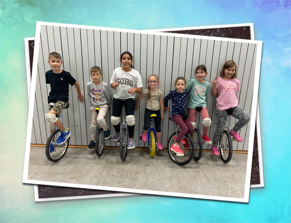 Fünf Mädchen und zwei Jungs von der 1. bis zur 4. Klasse haben sich in diesem Schuljahr dazu entschlossen, das Einrad Fahren zu erlernen.