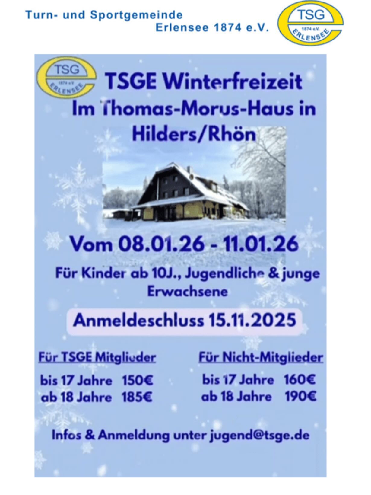 Nach der tollen ersten Winter-Freizeit im Januar 2025, gibt es Anfang 2026 die zweite Winter-Freizeit der TSGE. Organisiert wird diese vom Jugend-Team. Interessierte sollten sich schnell dazu anmelden, denn die Plätze sind begrenzt.
