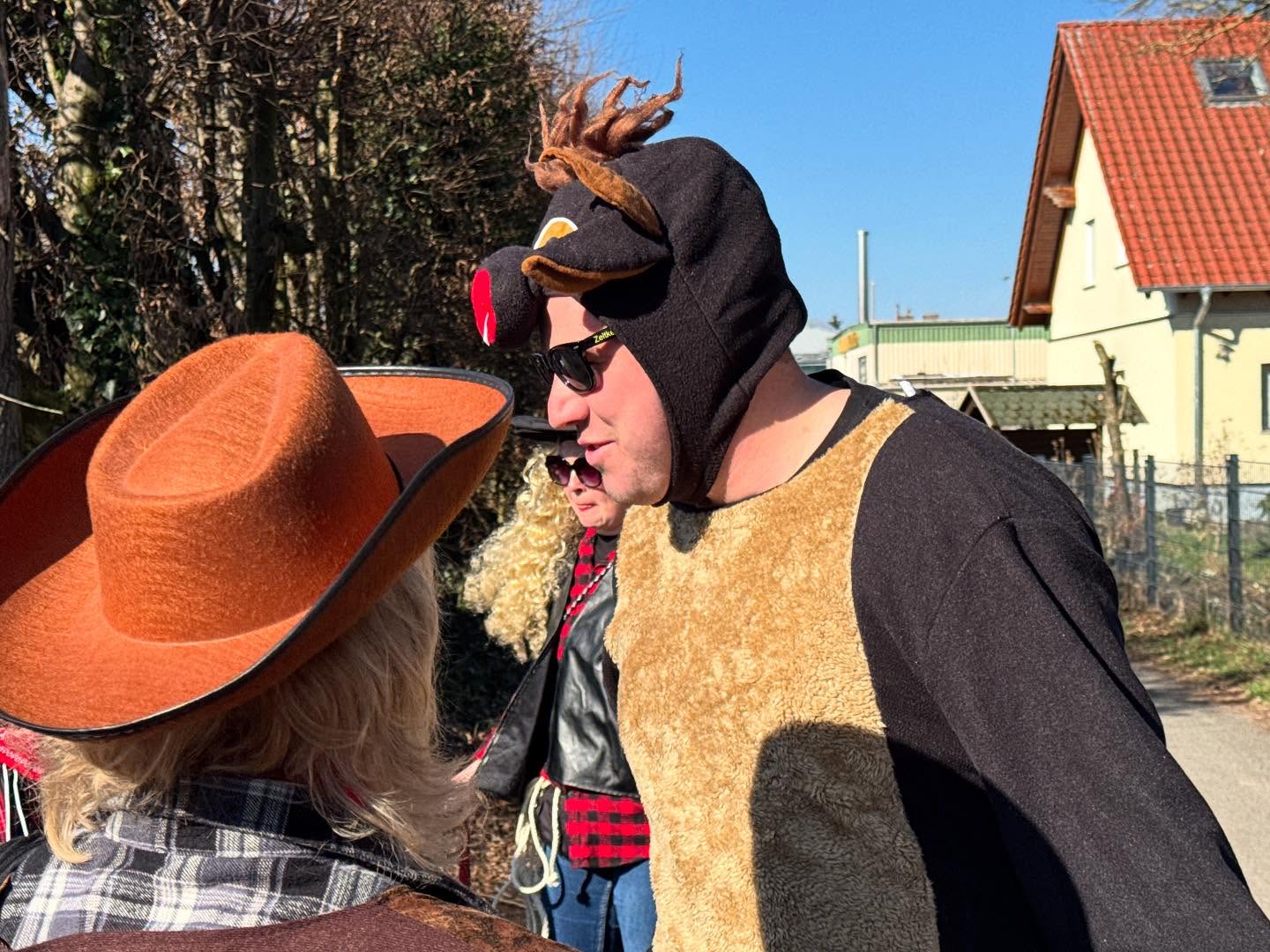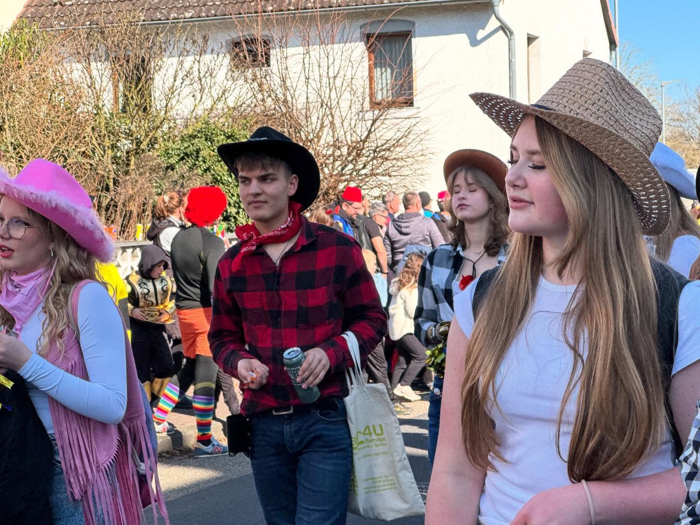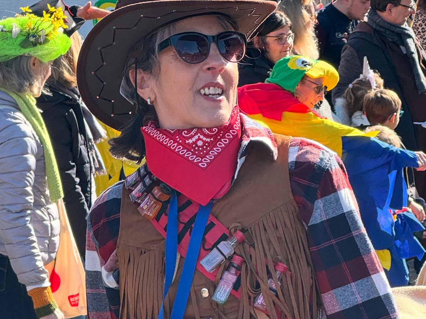 Und so entstanden die Erlenseer Wasserbüffelcowboys, die dann schließlich am Faschingssonntag fröhlich `Helau` rufend sich dem Faschingsumzug des NCC Niederissigheim als Fußgruppe anschließen durfte.