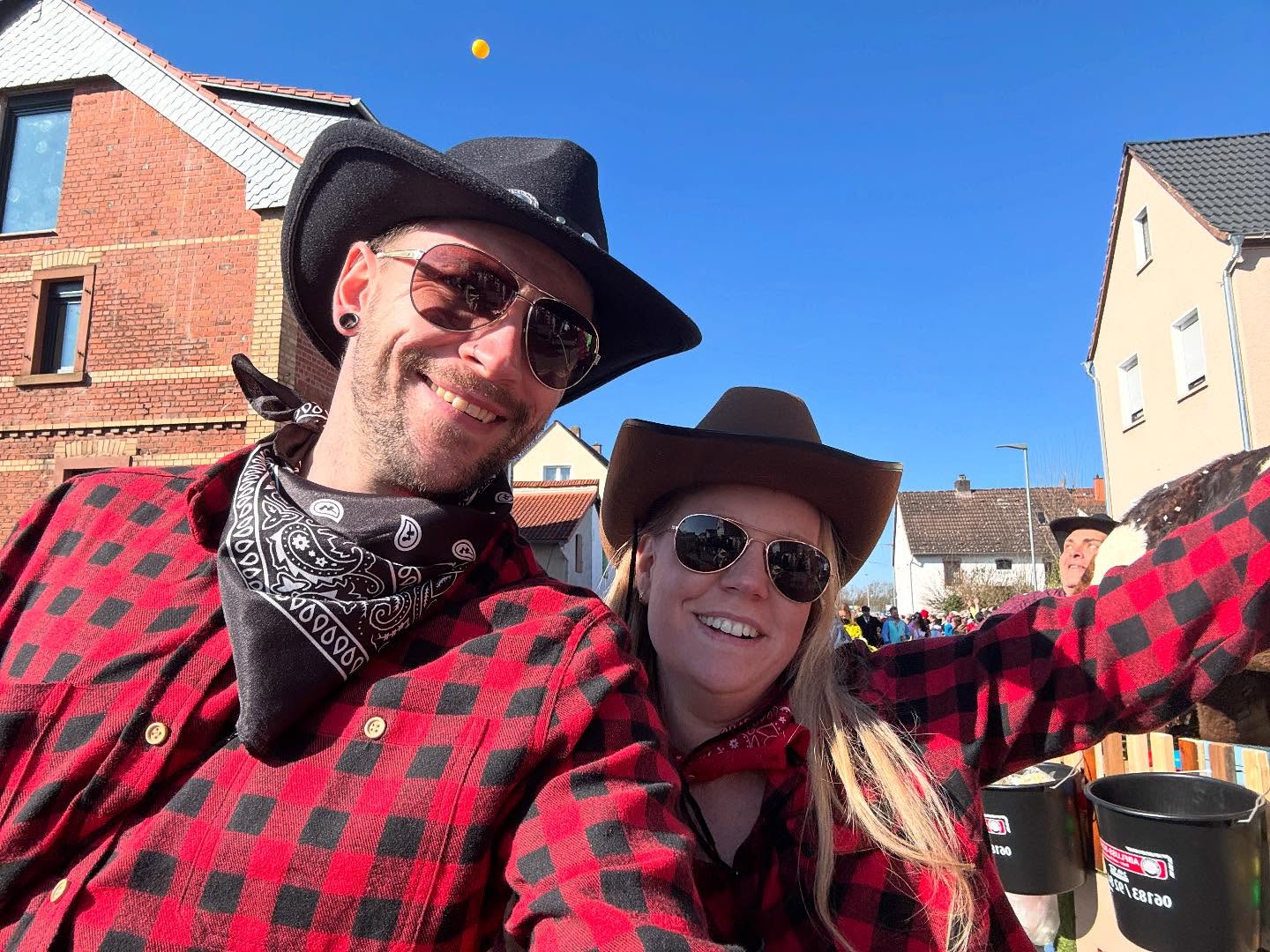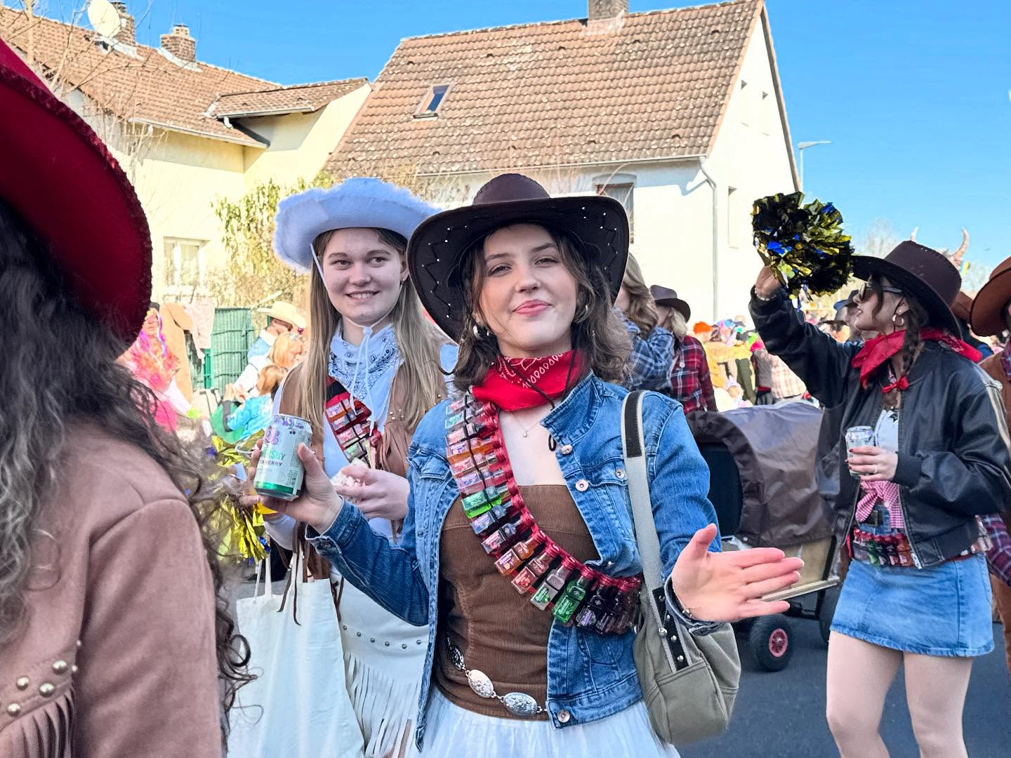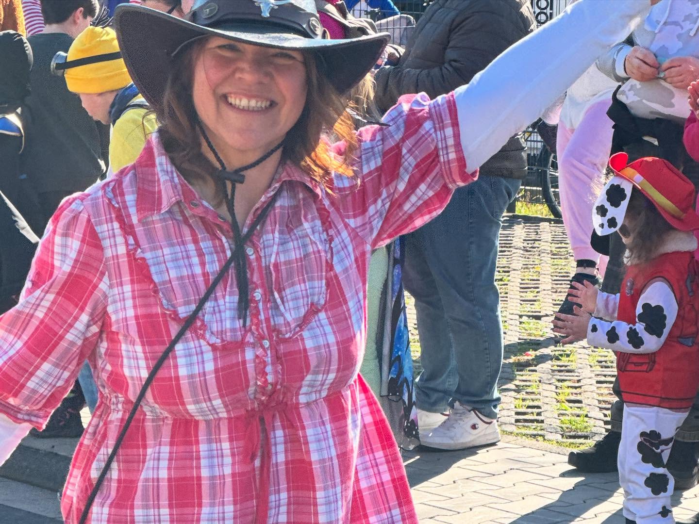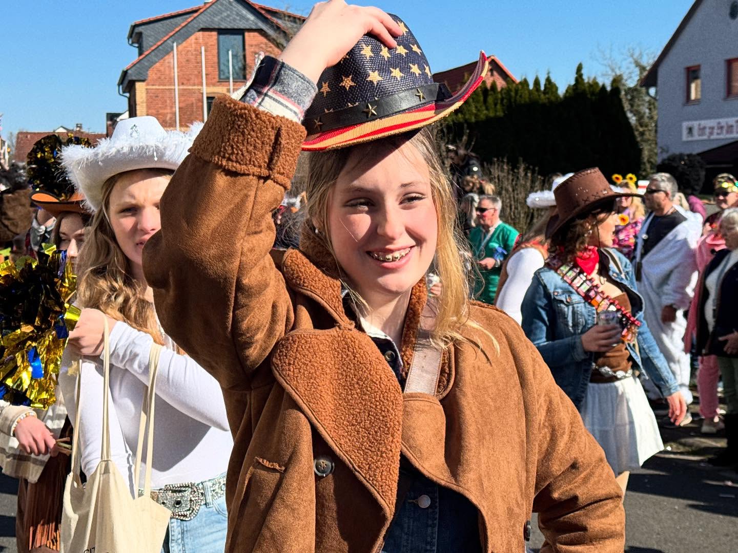 Und so entstanden die Erlenseer Wasserbüffelcowboys, die dann schließlich am Faschingssonntag fröhlich `Helau` rufend sich dem Faschingsumzug des NCC Niederissigheim als Fußgruppe anschließen durfte.