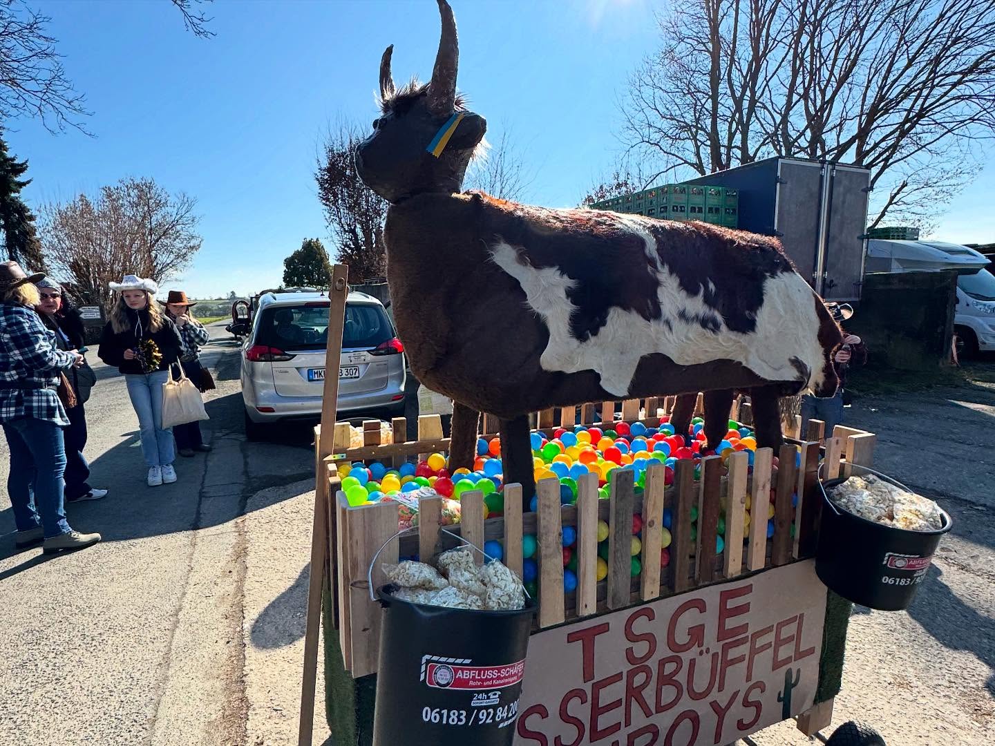 Einen großen Wafferbüffel auf Rädern ziehend, mit Planwagen und Postkutsche, gefüllt mit Süßigkeiten und kleinen Bällen, „TSG Helau, Erlensee Helau, Issigheim Helau“ rufend, Bonbons werfend, zur Musik schön und schräg mitsingend und tanzend zog es uns im Trubel durch Issigheim.