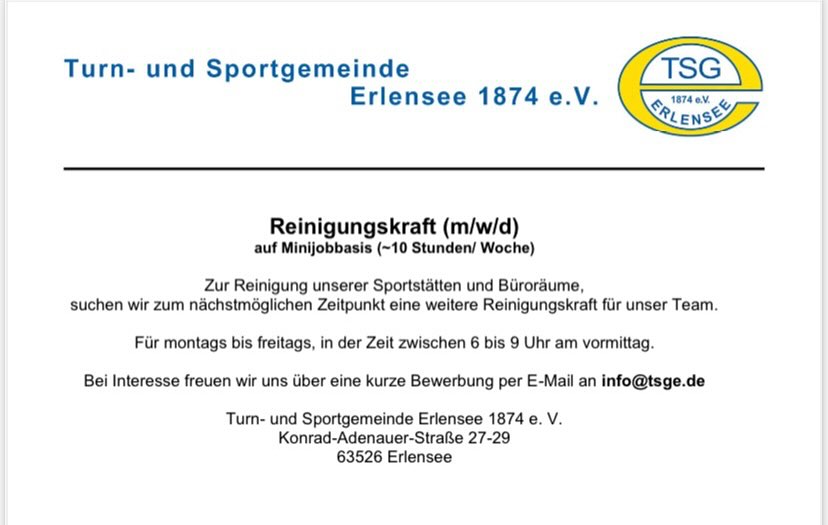 Zur Reinigung unserer Sportstätten und Büroräume, suchen wir zum nächst möglichen Zeitpunkt eine weiter Reinigungskraft für unser Team.