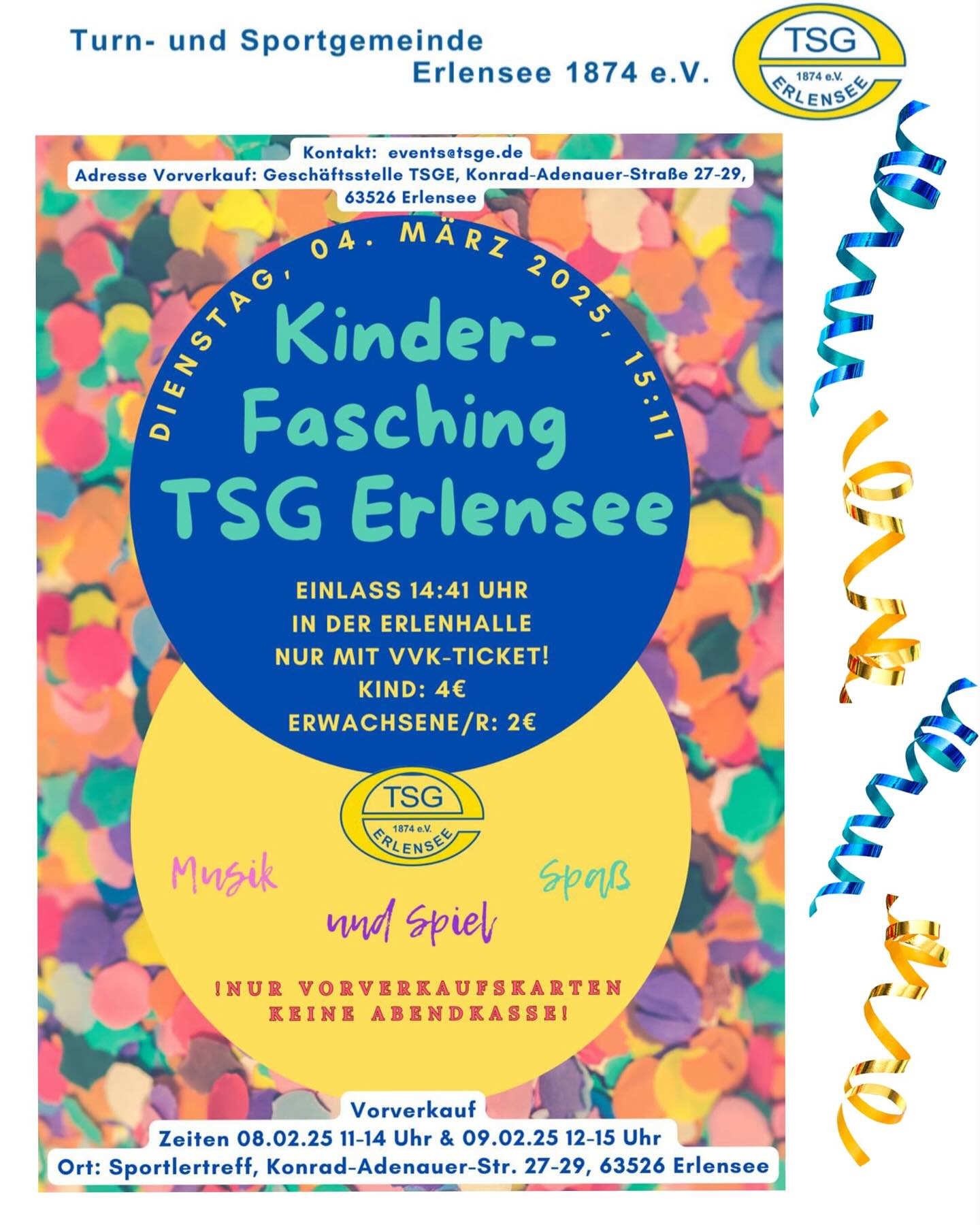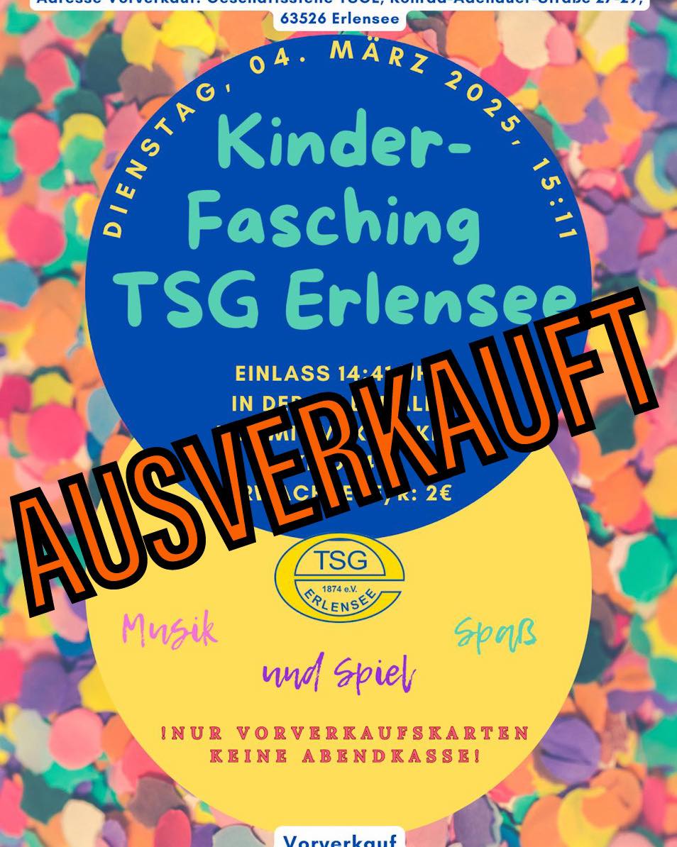 Am 04. März ist es wieder soweit! Die TSGE lädt am zum Kinderfasching für die Jüngsten in die Erlenhalle ein. Ab 14:41 Uhr ist Einlass, ab 15:11 Uhr beginnt das Programm. Die Gäste dürfen sich auf Mitmachaktionen, Auftritte aus den Abteilungen und musikalische Unterhaltung freuen. Selbstverständlich ist auch bestens für das leibliche Wohl gesorgt.