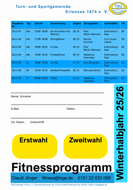 So wie sich die Abteilung Fitness langsam verändert, verändert sich auch das Formular zur Anmeldung. Ihr findet es zum Winterhalbjahr hin in einem winterlichen blau und für das Sommerhalbjahr in einem sonnigen gelb und alles auf den Punkt gebracht.