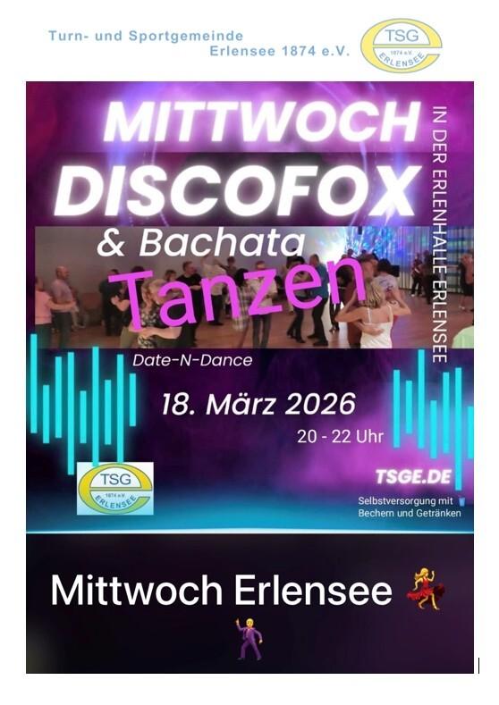 bereits zum 3. Mal verwandelt sich der große Saal der Erlenhalle in eine Disco. Die Tanzabteilung lädt herzlich zur besonderen Tanzveranstaltung "Discofox and More" ein!