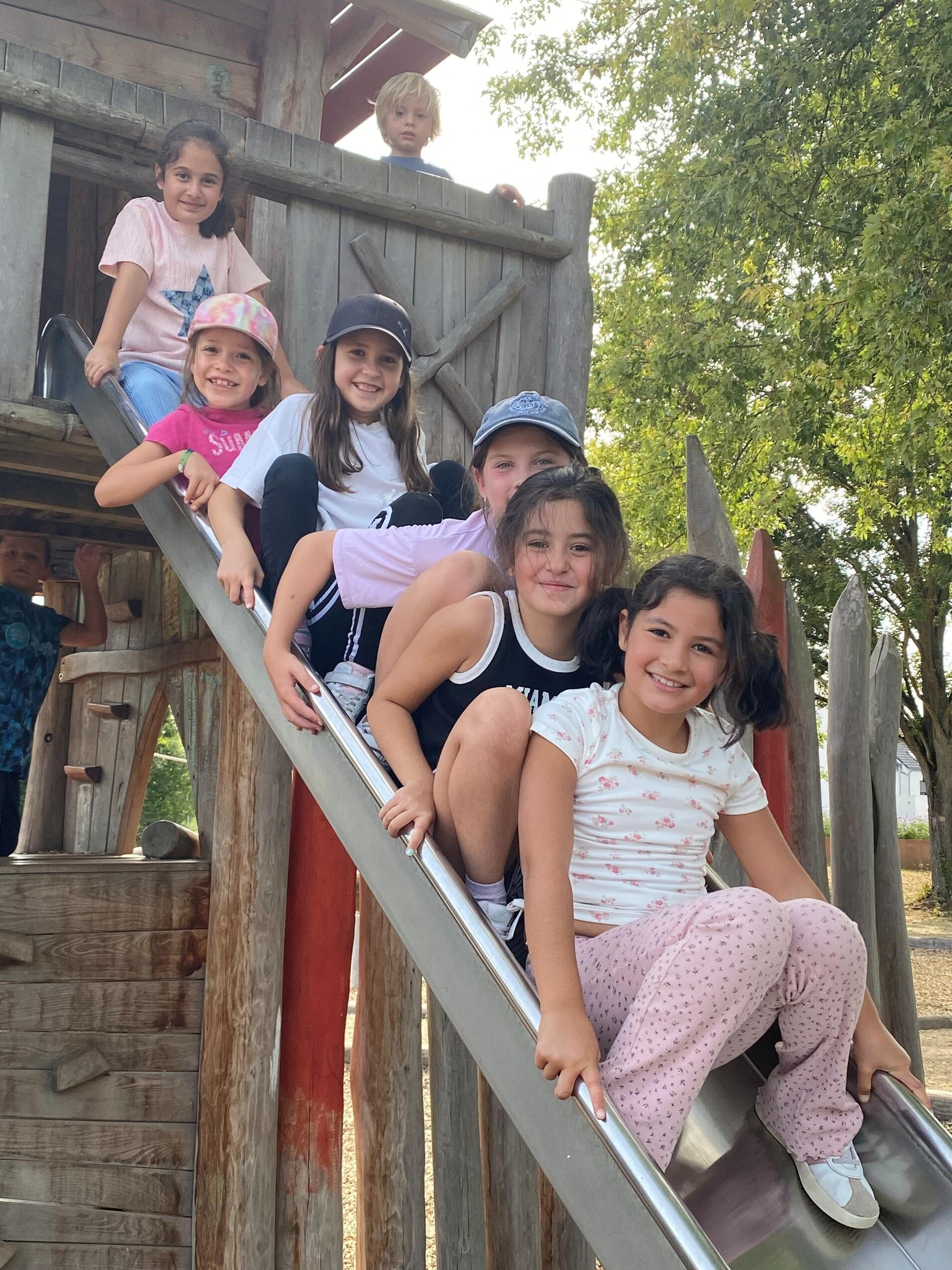 Ob drinnen oder draußen. Es findet sich immer eine Möglichkeit um sich gemeinsam auszupowern. Und wenn es dann noch auf den angrenzenden Spielplatz geht, umso besser. Die Geräte dort bieten so viele Möglichkeiten, auch für Kinder ab 7 Jahre.